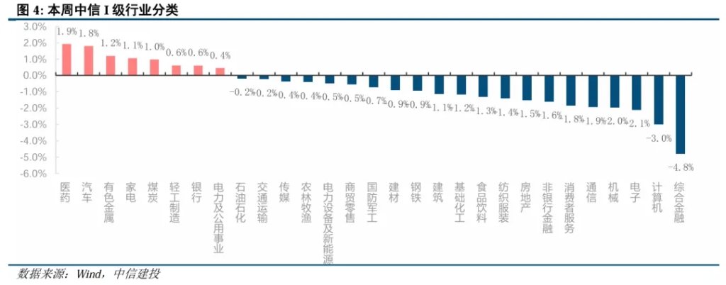本周医药、汽车和有色金属板块领涨,综合金融、计算机和电子板块领跌。
