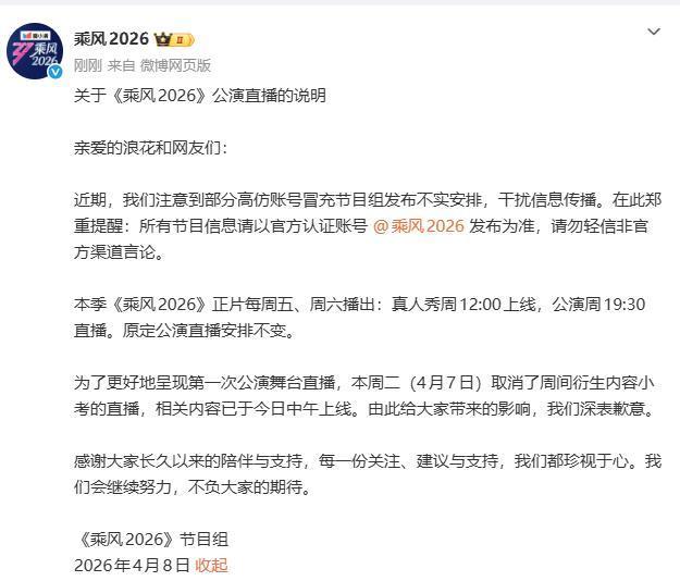 《乘风2026》节目组4月8日发布关于《乘风2026》公演直播的说明,亲爱的浪花和网友们:近期,我们注意到部分高仿账号冒充节目组发布不实安排,干扰信息传播。在此郑重提醒:所有节目信息请以官方认证账号@乘风2026发布为准,请勿轻信非官方渠道言论。